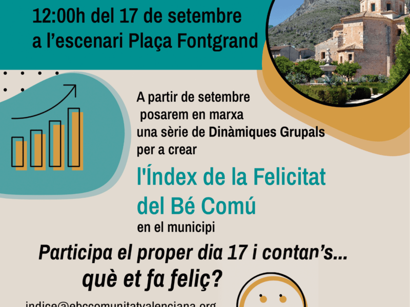 El pròxim 17 de Setembre a les 12.00 en la Plaça de la Font Grand, Simat: «Jornada Inaugural de l’Índex de Felicitat » Tallers infantils de dibuix, dinàmiques participatives, explica’ns: […]